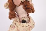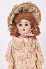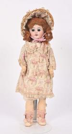 Poupée de la S.F.B.J moule 60, taille 4/0, tête porcelaine, bouche ouverte avec dents dans le haut, yeux de verre marron, corps semi-articulé, habits, perruque. 37 cm.