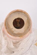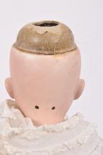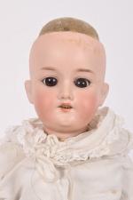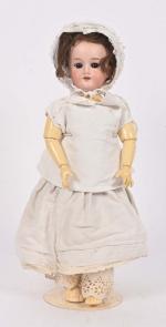 Poupée Armand Marseille moule 390, taille 4, tête porcelaine, bouche ouverte avec dents dans le haut, yeux marron dormeurs, corps tout articulé, habits, perruque. 49 cm.