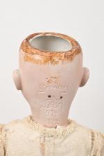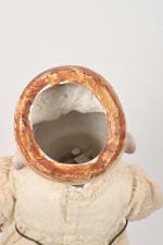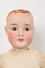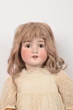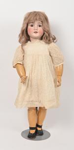 Schoenau & Hoffmeister, poupée moule 914 taille 12 1/2, tête porcelaine, bouche ouverte, yeux marron anciennement dormeurs, corps tout articulé, robe blanche, perruque. 74 cm.