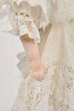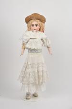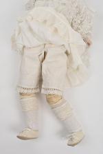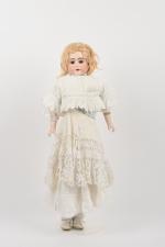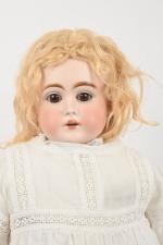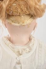 tête-buste fixe en porcelaine marquée en creux "J", bouche ouverte avec quatre dents dans le haut, yeux bleus dormeurs, avant-bras en biscuit, corps articulé en cuir et tissu, calotte en carton et perruque en mohair blond d'origine. 61 cm.