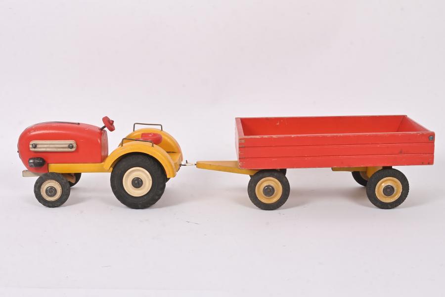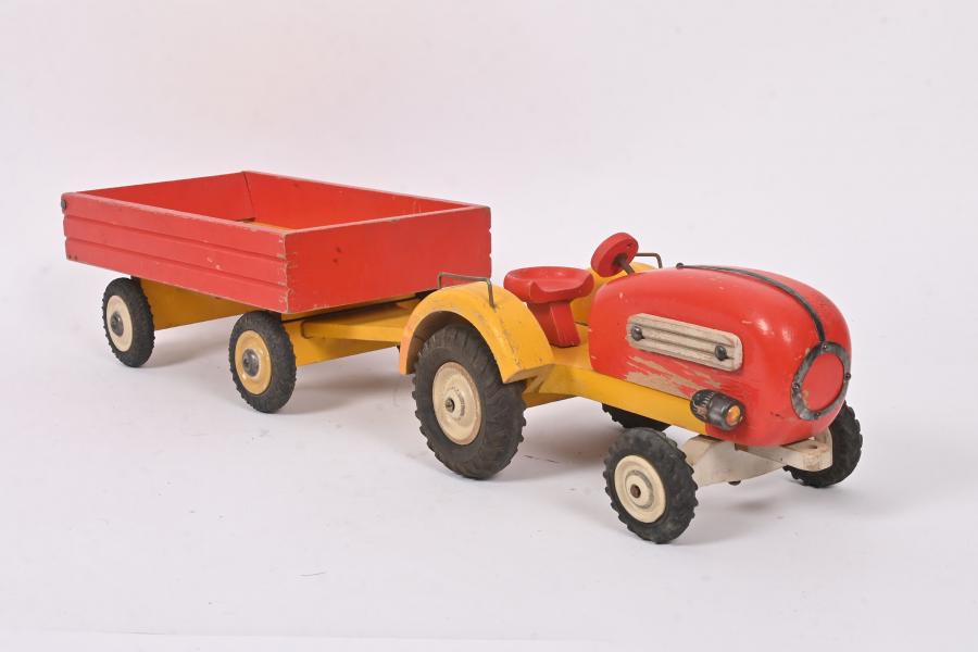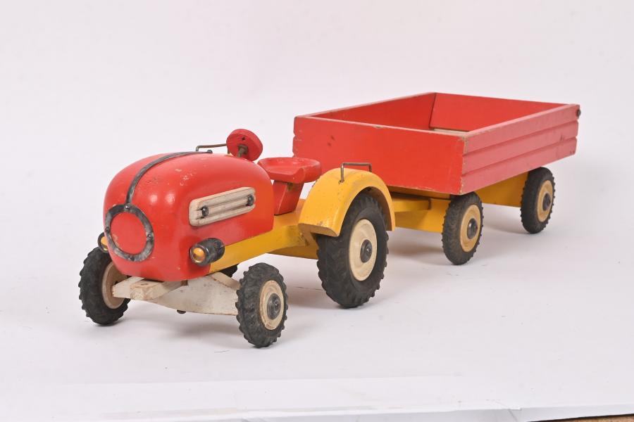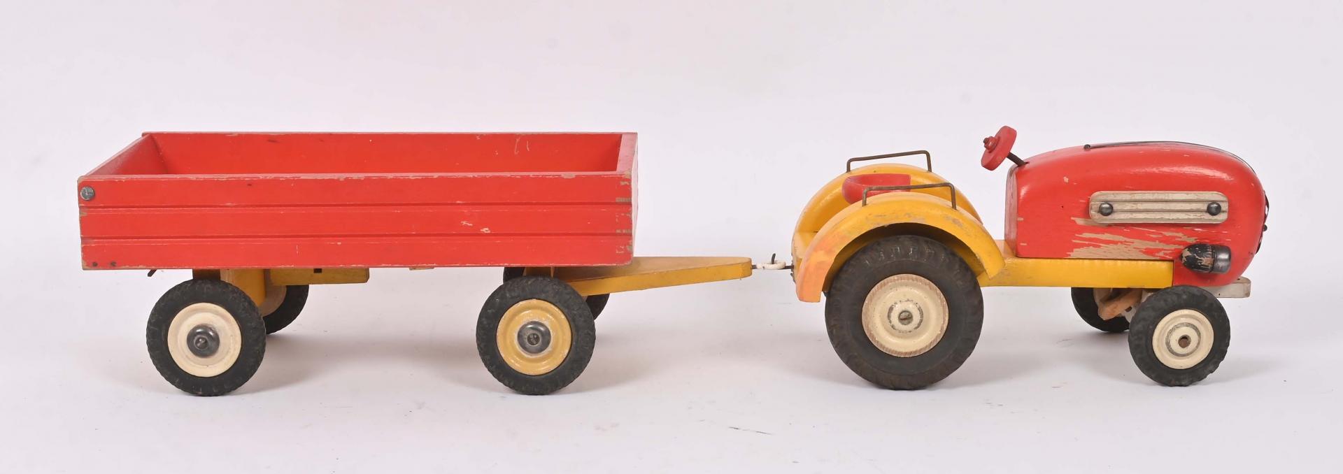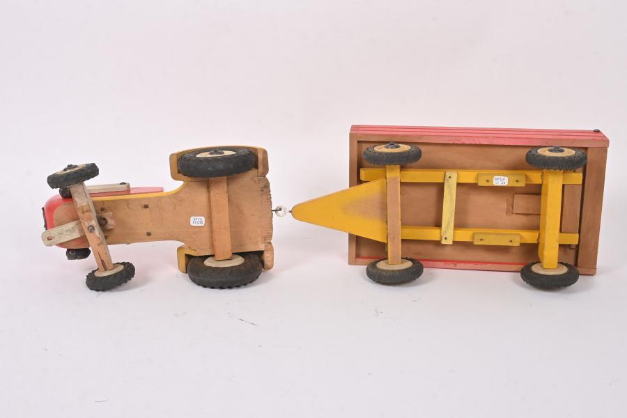 Tracteur agricole en bois peint rouge et jaune, avec roues avant directionnelles, pneus caoutchouc et remorque à benne basculante, (petites usures d'usage). L. Totale 75 cm.