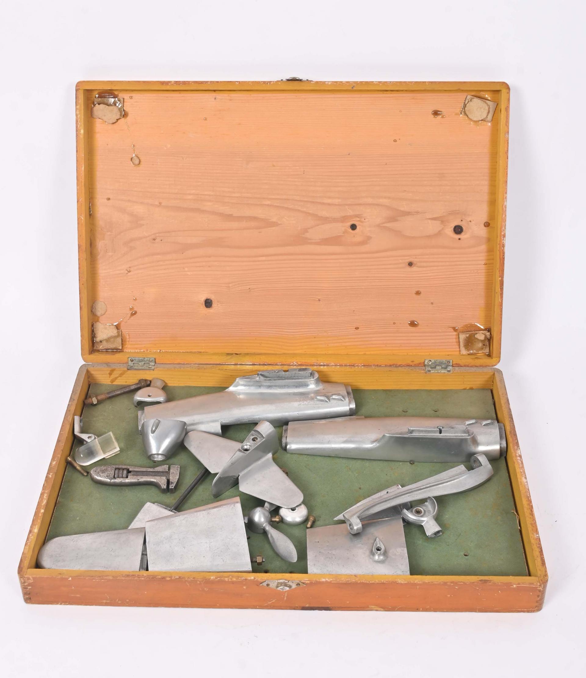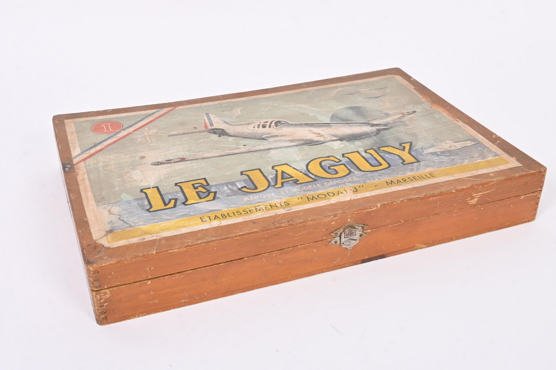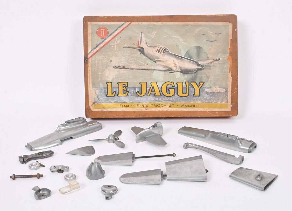 Etablissements Modalu, "Le Jaguy" Avion à monter en aluminium. Dans son coffret bois avec étiquette. Etat d'usage.