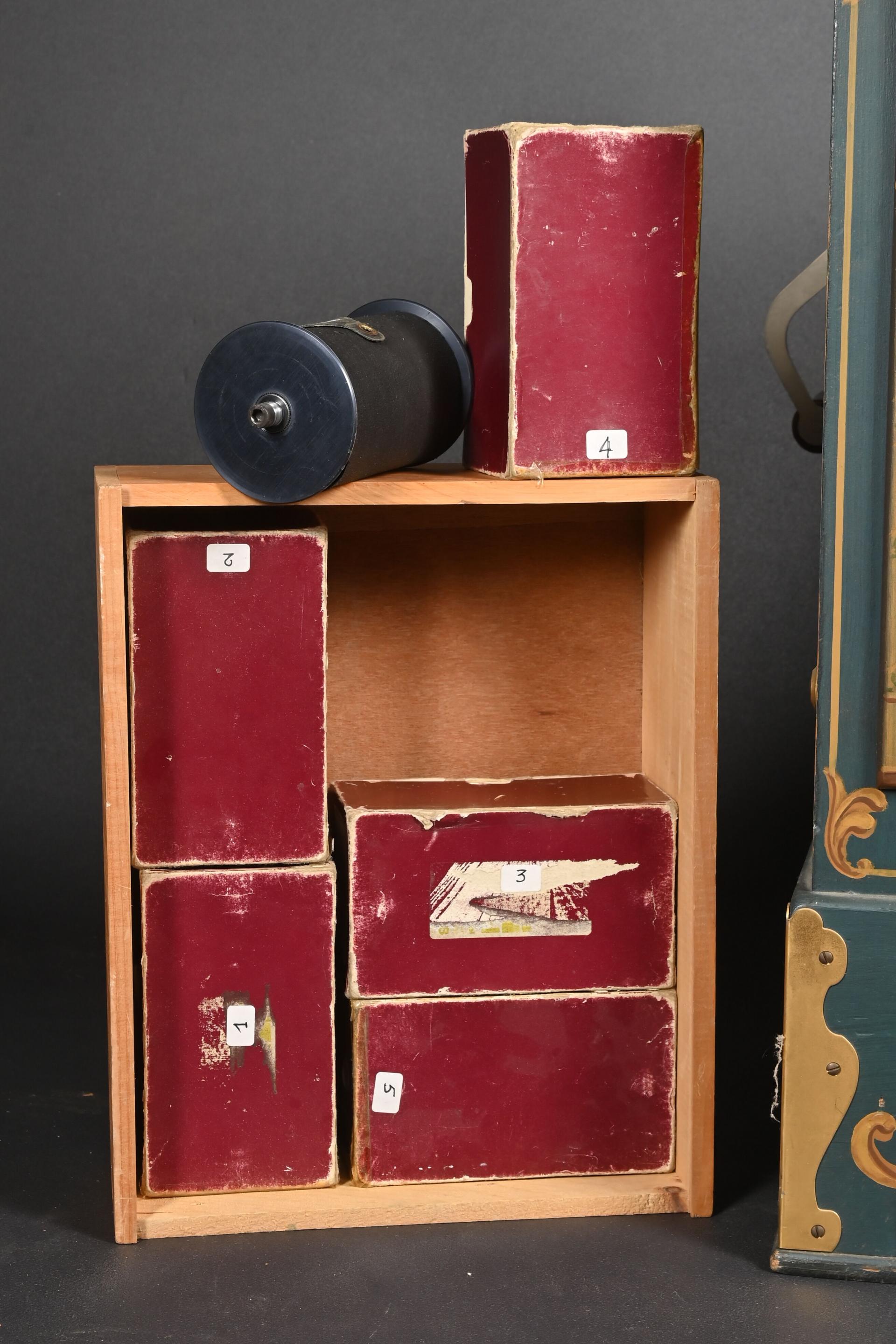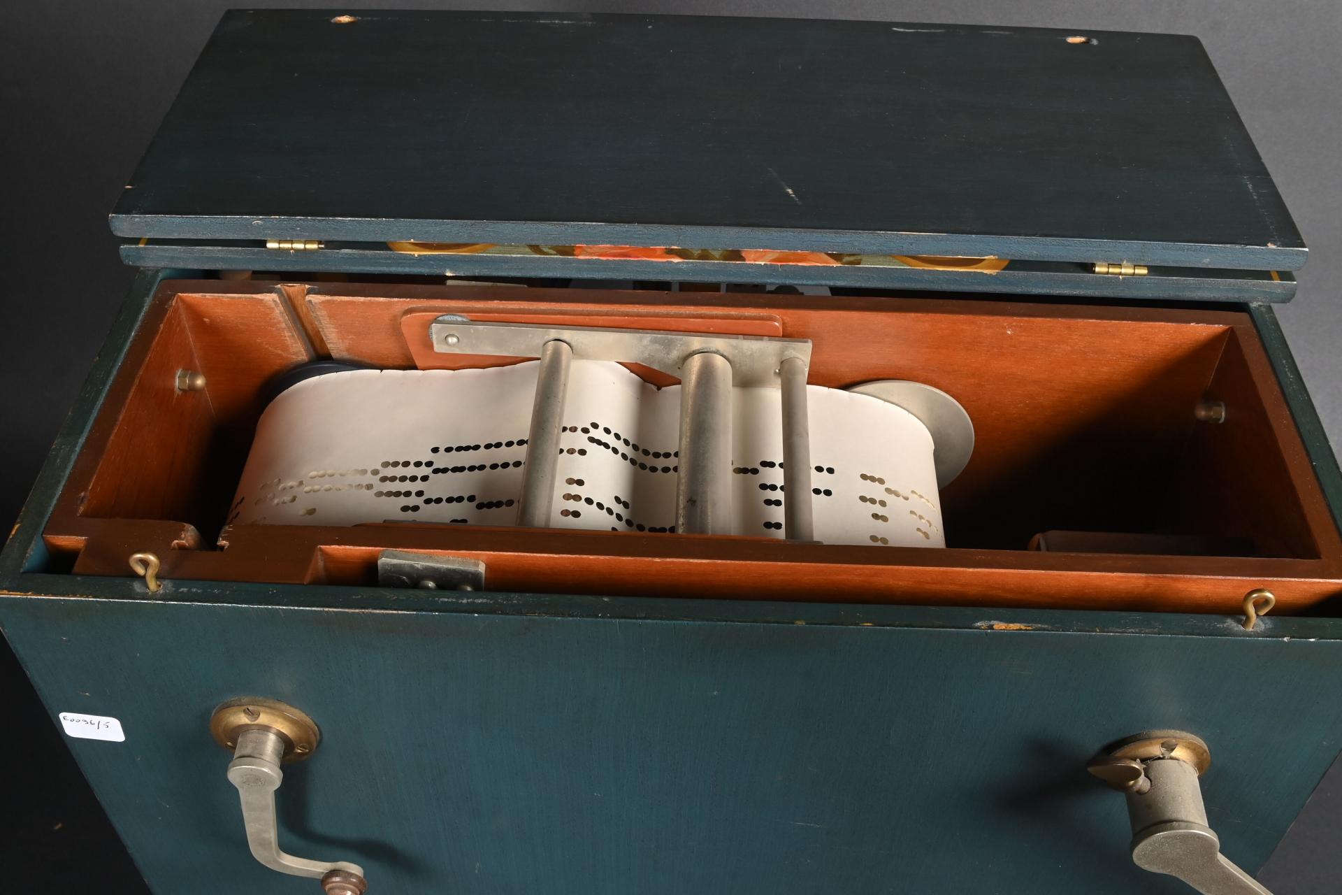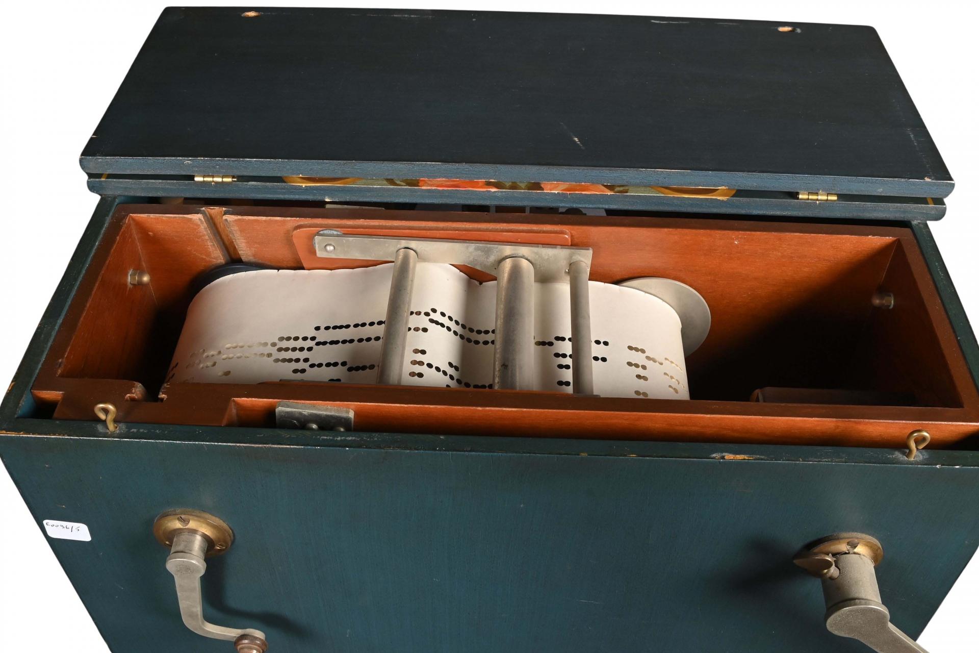 Orgue de barbarie "Raffin" 20 notes, tuyaux bois, avec plusieurs rouleaux de papier perforé. Bon état. 31 x 46 x 58 cm.