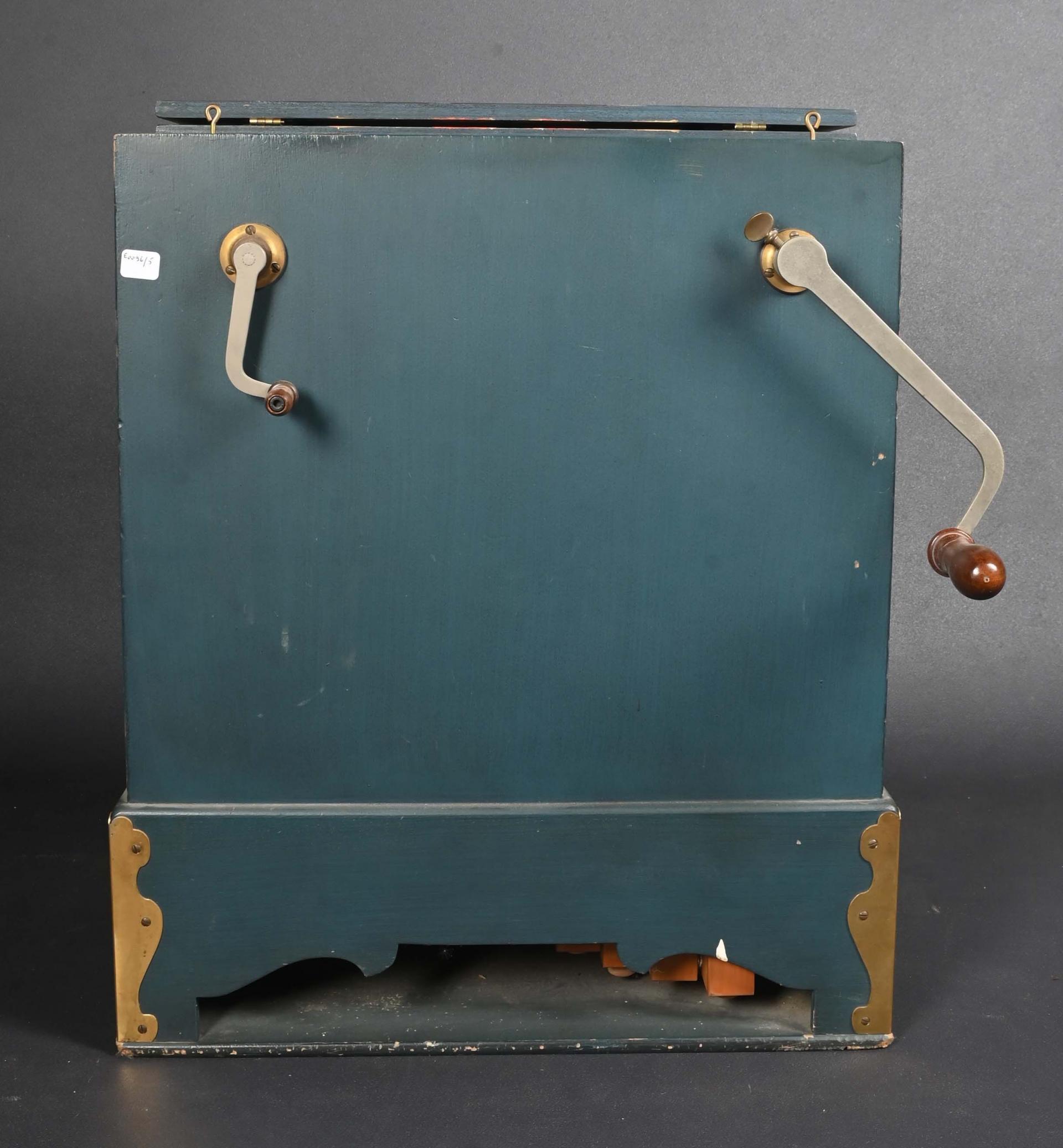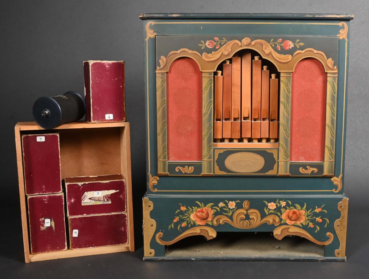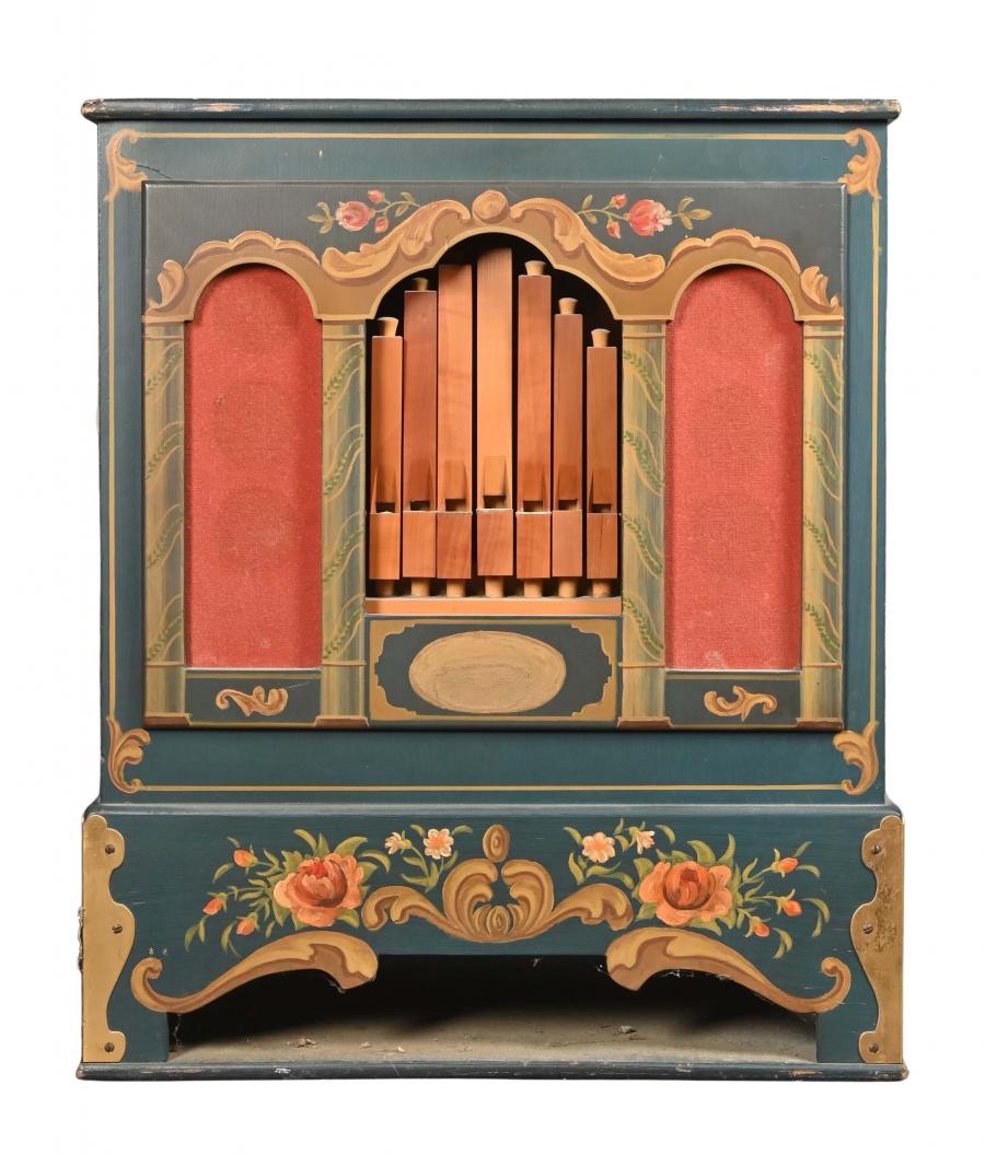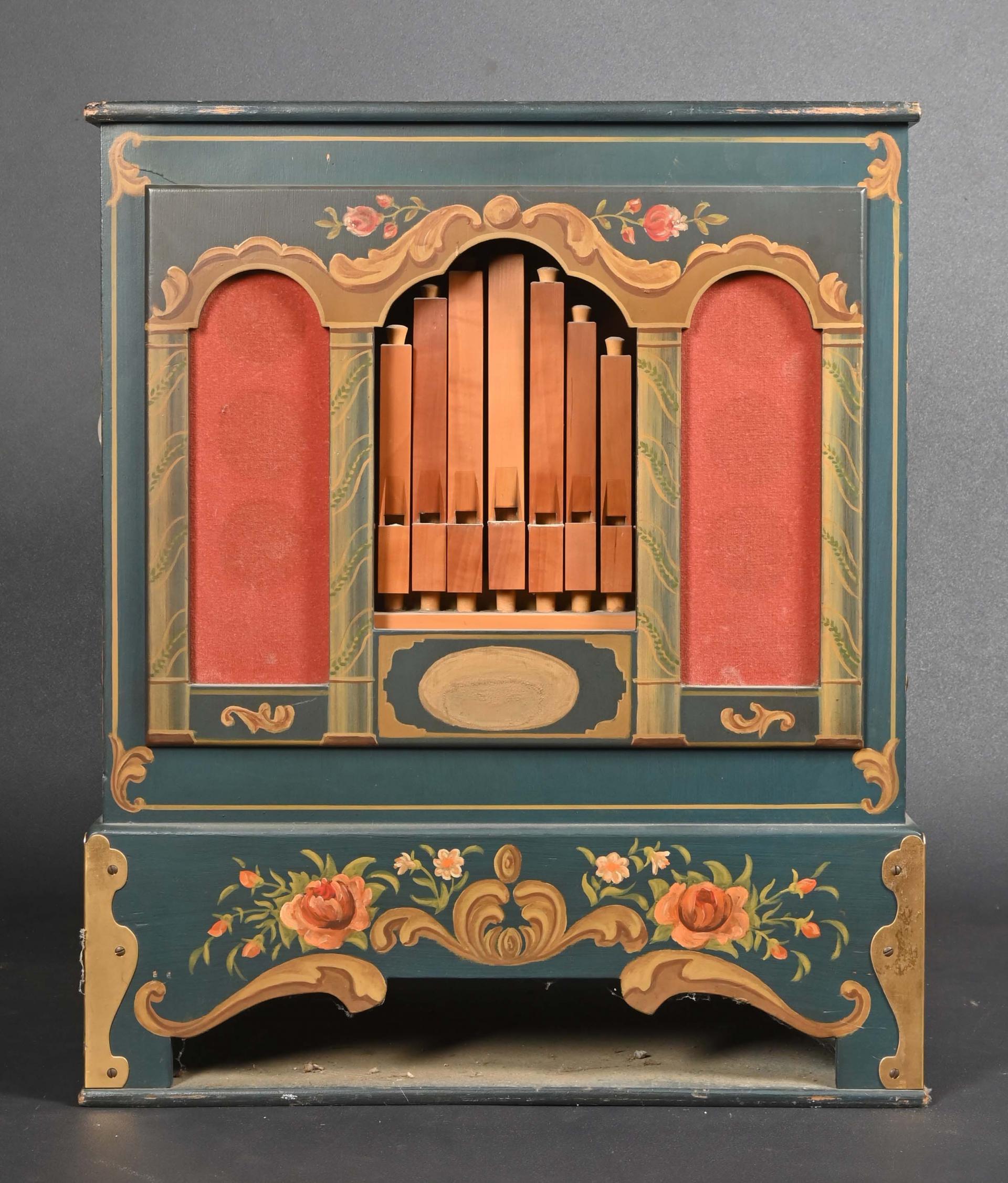 Orgue de barbarie "Raffin" 20 notes, tuyaux bois, avec plusieurs rouleaux de papier perforé. Bon état. 31 x 46 x 58 cm.