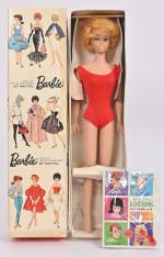 Mattel, Barbie, Bubble Cut blonde, rouge à lèvres blanc, maillot, paire de mules, clous d'oreilles, catalogue. Vers 1960. Dans une boîte pour Platinium réf. 850.