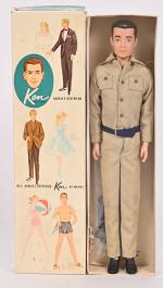 Mattell, Barbie, Ken brun, jambes raides avec vêtements militaires, réf. 750. Vers 1960. Bel état, en boîte (usures).