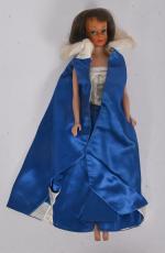 Mattel, Barbie, American Girl châtain coupe longue, visage bronzé. Sur un corps à jambes raides. Porte robe et manteau Midnight Blue.