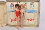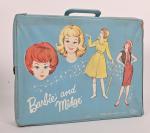 Mattel, Barbie, double valise bleue Barbie Midge (état d'usage) avec une Bubble Cut brune et une MidgebBlonde.