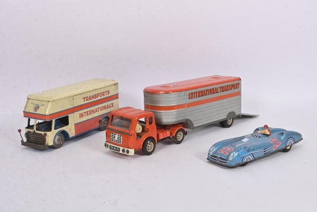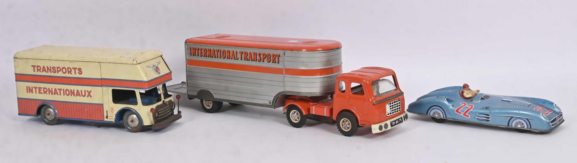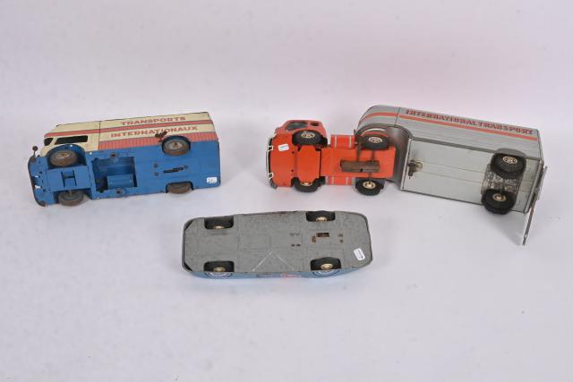en tôle lithographiée, état moyen : International Transport, tracteur routier avec remorque mécanique à clé fixe, Transports Internationaux mécanique avec éclairage et voiture de course n° 22 à friction.