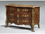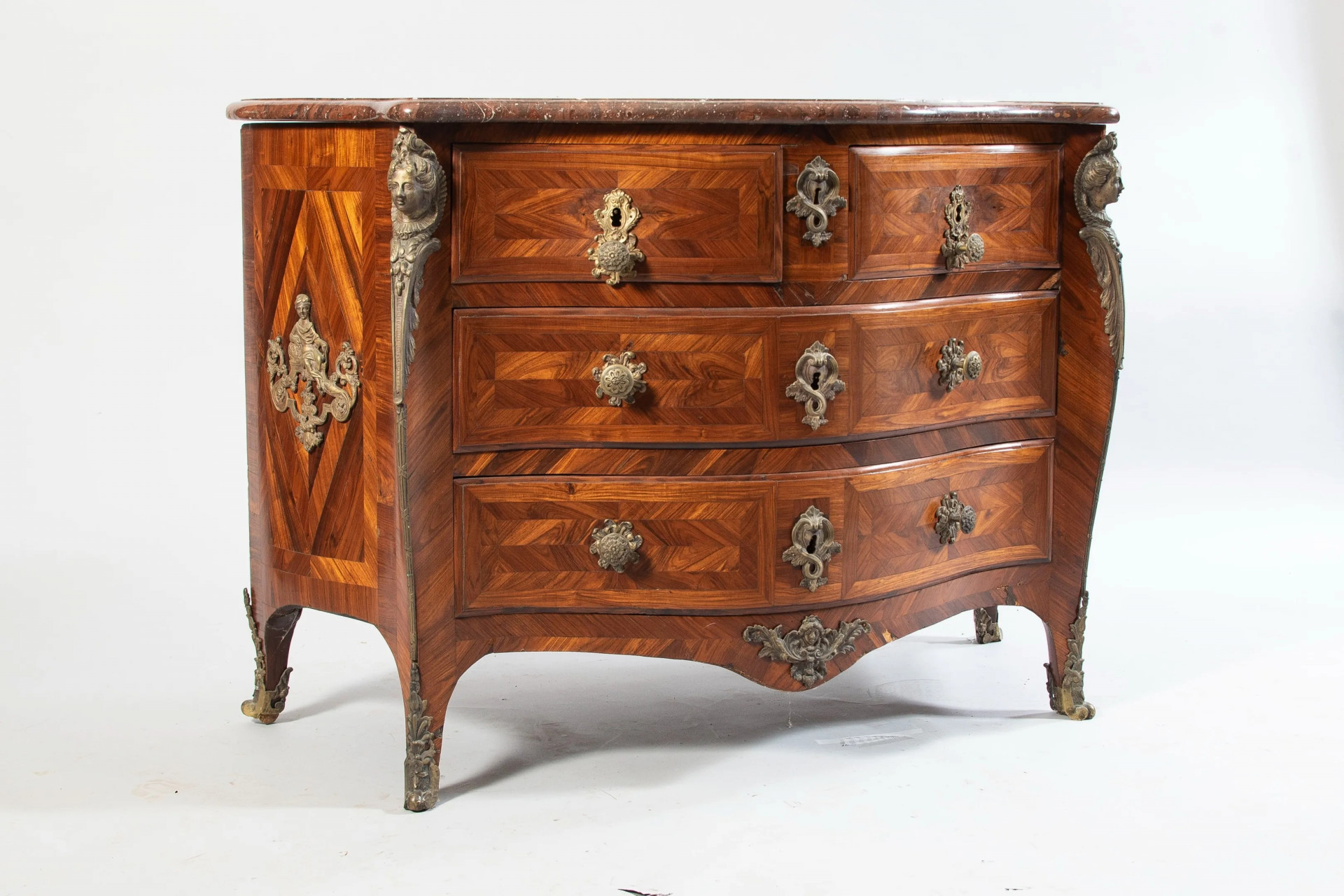 Commode à façade et côtés galbés en placage de bois de violette, montants antérieurs pincés. Elle ouvre à 4 tiroirs sur 3 rangs, belle ornementation de bronzes ciselés et dorés (certains rapportés), plateau de marbre, mouluré rouge griotte. Epoque Régence (certains bronzes rapportés, quelques accidents au placage)