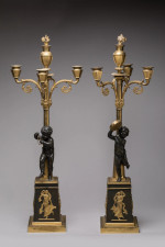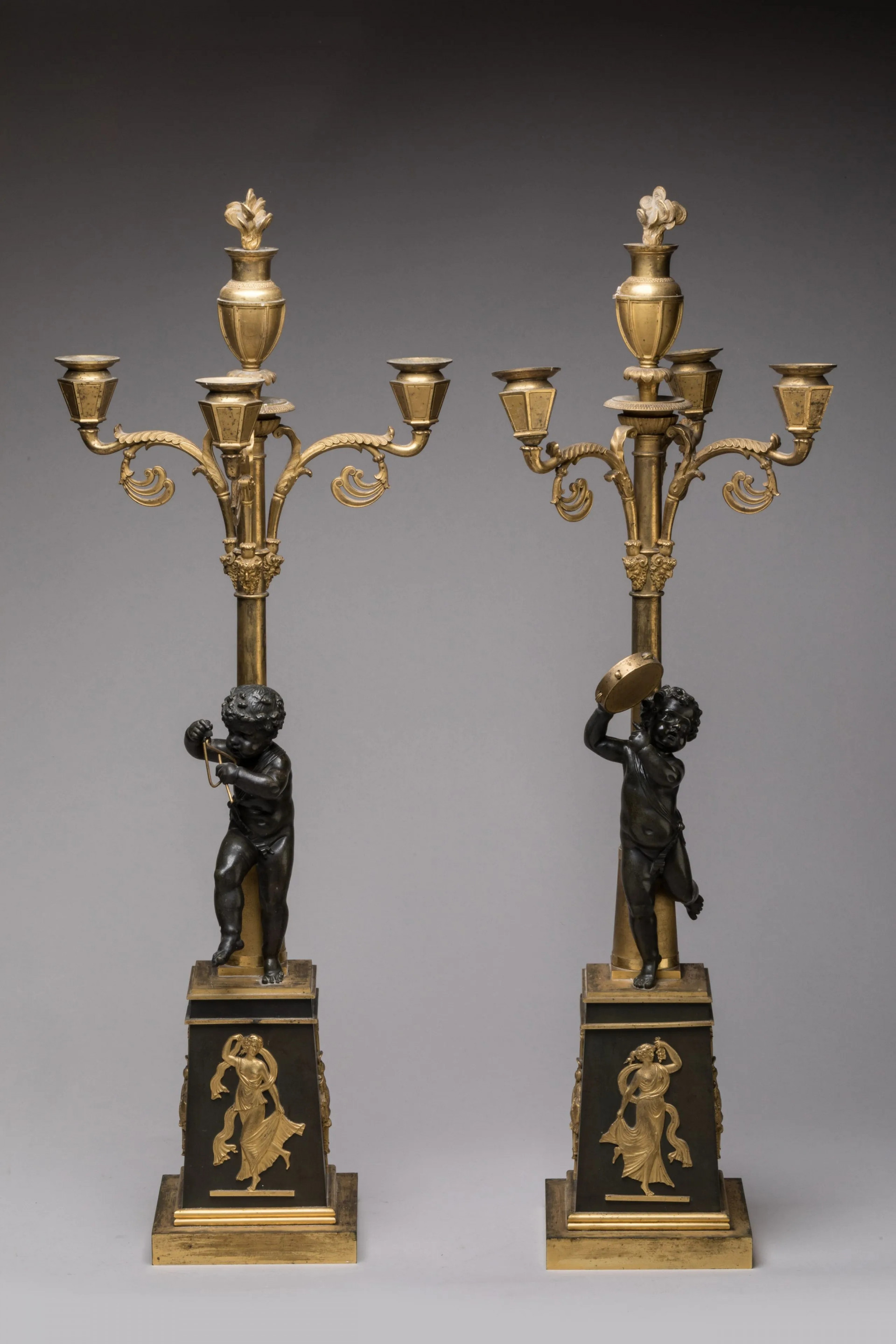 Paire de candélabres aux putti musiciens en bronze ciselé, doré et patiné à quatre lumières, la base quadrangulaire pyramidale à décor d allégories de la musique supporte une colonne, coiffée d un vase, portant trois bras à décor de palmettes et rinceaux et des putti l un jouant du tambourin et le second du triangle. XIXe siècle H. : 68 cm