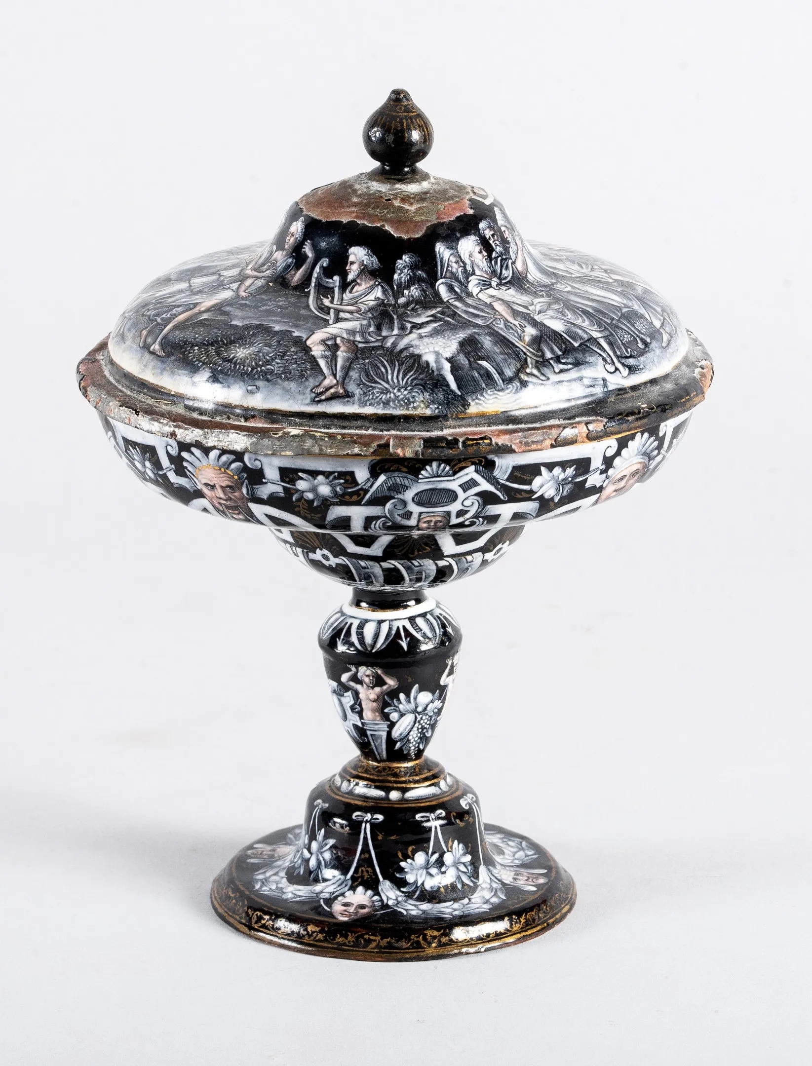 Coupe couverte sur piédouche en émail peint en grisaille décoré de scènes bibliques. Limoges, XVIe siècle (accidents et manques, couvercle rapporté) haut : 24 - diam : 17 cm