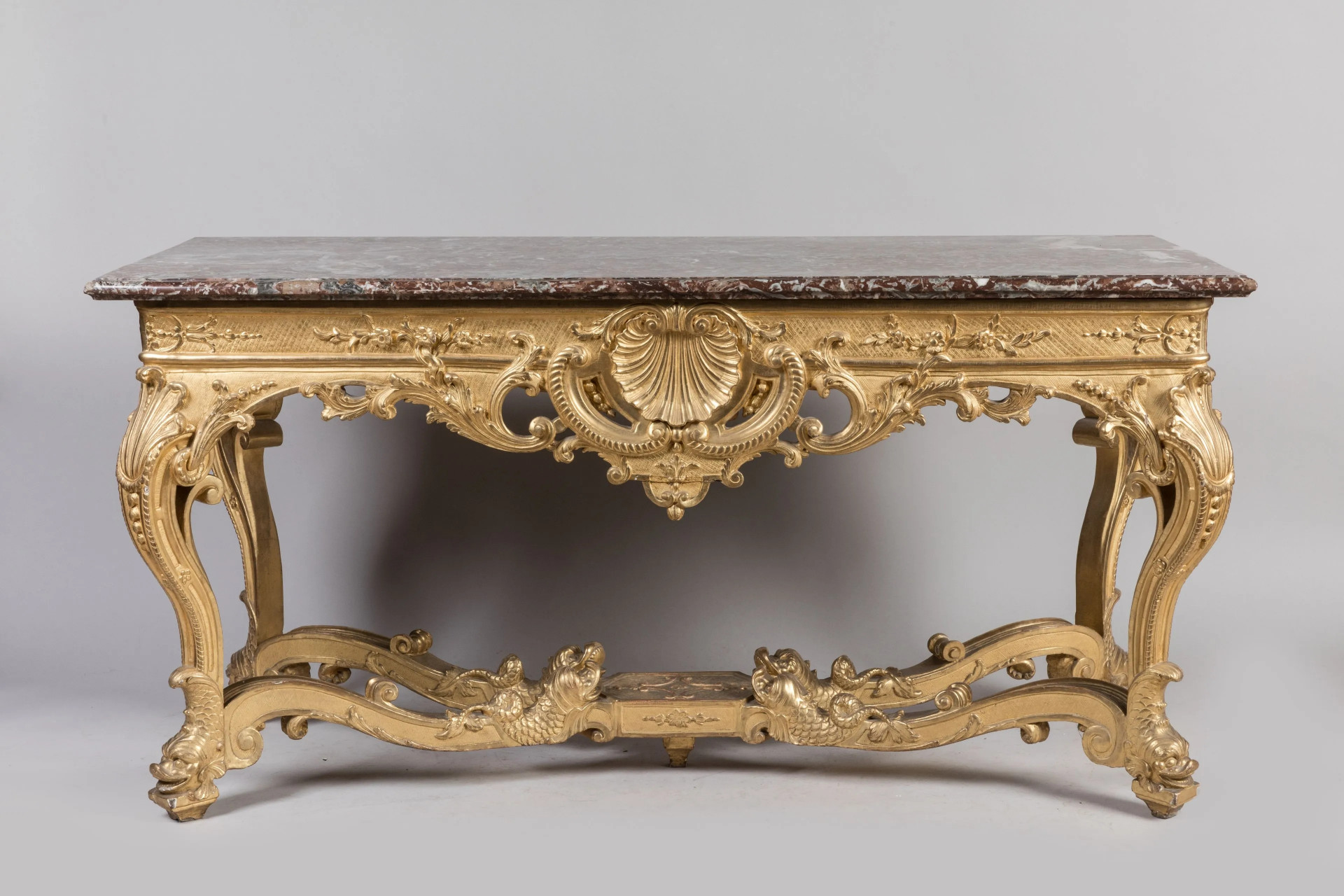 Table de milieu dite table à gibier en bois mouluré, sculpté et doré, à décor de coquilles, rinceaux feuillagés, feuilles d'acanthe, coquilles et enroulements, reposant sur quatre pieds cambrés à sabots en têtes de dauphin réunis par une entretoise en X en dauphin. Plateau de marbre rouge des Flandres. Style Régence Légers accidents 80 x 164 x 76 cm