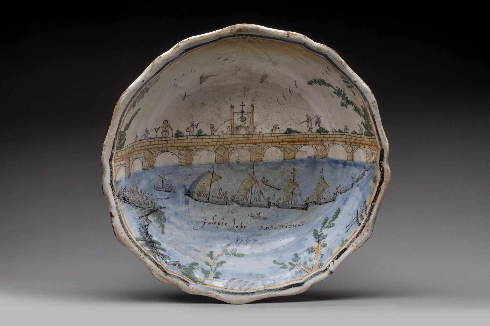 Nevers Saladier rond à bord contourné en faïence à décor polychrome patronymique au pont de Nevers, le pont animé de dix personnages, un train de gabares sur le fleuve et l inscription : josephe labé Anne Richout 1787. XVIIIe siècle. D. 35 cm. Une petite fêlure.