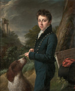 Charles Pierre VERHULST (Anvers 1774 - Bruxelles 1820) Portrait d'un jeune dessinateur avec son chien Toile 115 x 96 cm Signée, datée et localisée en bas à gauche : CP. VERHULST. Ft/ BRUXELLES/ 1819. Restaurations anciennes