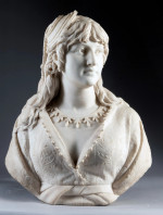 FLORENCE, atelier des Romanelli, fin du XIXe siècle, Jeune femme au petit chapeau, Buste en marbre, signé et situé "R. Romanelli" / Florence" à l'arrière, haut : 60 cm Expert : cabinet Lacroix-Jeannest