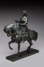 BARYE Antoine-Louis (1795-1875) Charles VII le Victorieux Modèle créé vers 1836-1840 et 1857 Bronze à patine brune Signé « BARYE » Porte la marque « BARBEDIENNE. FONDEUR » et le rare cachet à l or «FB » Dim. :38,5 X 33,5 cm uvre en rapport : Antoine-Louis Barye, Charles VII le Victorieux, 1840, statuette en bronze, H. 30 x L. 27 x P. 10,5 cm, Paris, musée d Orsay, inv. OA 6363. Littérature en rapport : -Michel Poletti, Alain Richarme, Barye, le catalogue raisonné des sculptures, Paris, Gallimard, 2000, modèle répertorié sous le n° F 8, p. 73 ; -Florence Rionnet, Les Bronzes Barbedienne. L uvre d une dynastie de fondeurs (1834-1954), Paris, Arthena, 2016, modèle répertorié sous le n° Cat 403, p. 269. Expert: Sculptures et Collections