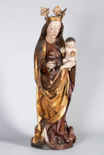 Ecole souabe, fin du XVème siècle, Vierge à l'Enfant debout sur un croissant de lune, Fort relief en bois polychromé, H. 94,6 cm (Petits accidents et restaurations, accidents aux fleurons de la couronne)