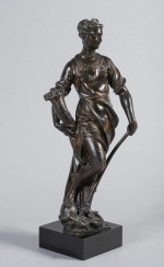Ecole vénitienne du début du XVIIème siècle d'après un modèle de Girolamo Campagna (1549-1625), Allégorie de la Paix dite aussi Cérès, Bronze avec traces de dorure, figure surmontant initialement un chenet H. 53 cm sur une base cubique en marbre noire