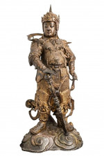 Chine époque Ming (1368 - 1644) Statuette en bronze laqué or, représentant le roi du ciel, tien wang en armure, debout sur un nuage, la main posée sur la poignée, haut : 151