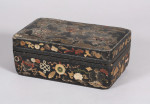 Boite de forme rectangulaire en laque incrusté de nacre et stéatite d'une chasse au cerf sur le couvercle et des huit symboles bouddhiques sur le côté.