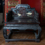 Fauteuil de dignitaire chinois en bois exotique sculpté et ajouré de scènes naturalistes avec pagode