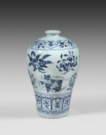 CHINE - Epoque YONGLE (1403 - 1424) Vase de forme meiping en porcelaine à décor en bleu sous couverte d'un registre de dix fruits dans leur feuillage reparties en deux registres. H. 36 cm.
