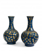 CHINE - Epoque GUANGXU (1875 - 1908) Paire de vases de forme "shangping" en porcelaine émaillée bleu poudré et décorée en émail or de médaillons de fleurs, oiseaux et fruits, d'une frise de lotus et caractère 'shou' (longévité)