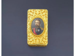 Tabatière de Présent, rectangulaire en or jaune gravée d'entrelacs feuillagés sur fond amati, le couvercle, à charnière est appliqué d'une miniature ovale sur ivoire représentant le buste de l'empereur Napoléon III, portant à gauche la signature : F. de FOURNIER à Paris
