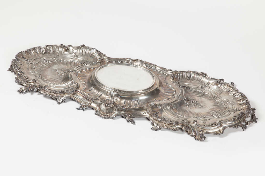 PLAT oblong en argent mouluré, l'aile monogrammée. Longueur 40 cm. Poids 818 g.