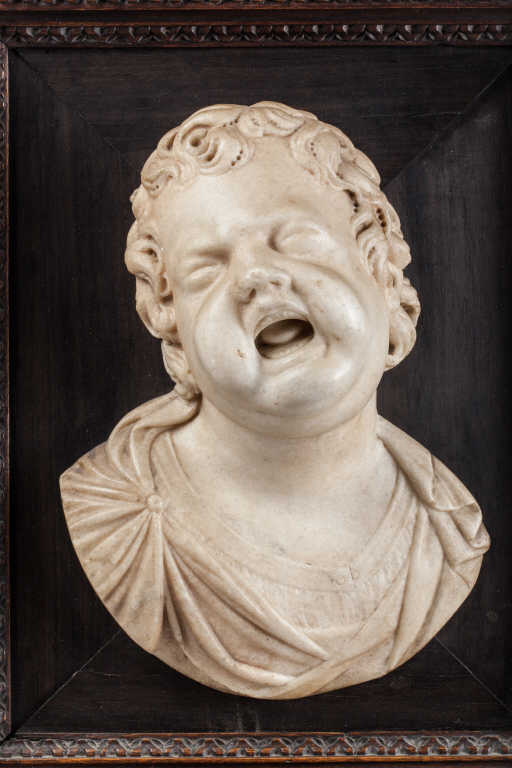 CONSOLE en pierre calcaire sculptée avec restes de polychromie représentant la tête d'un enfant grimaçant...