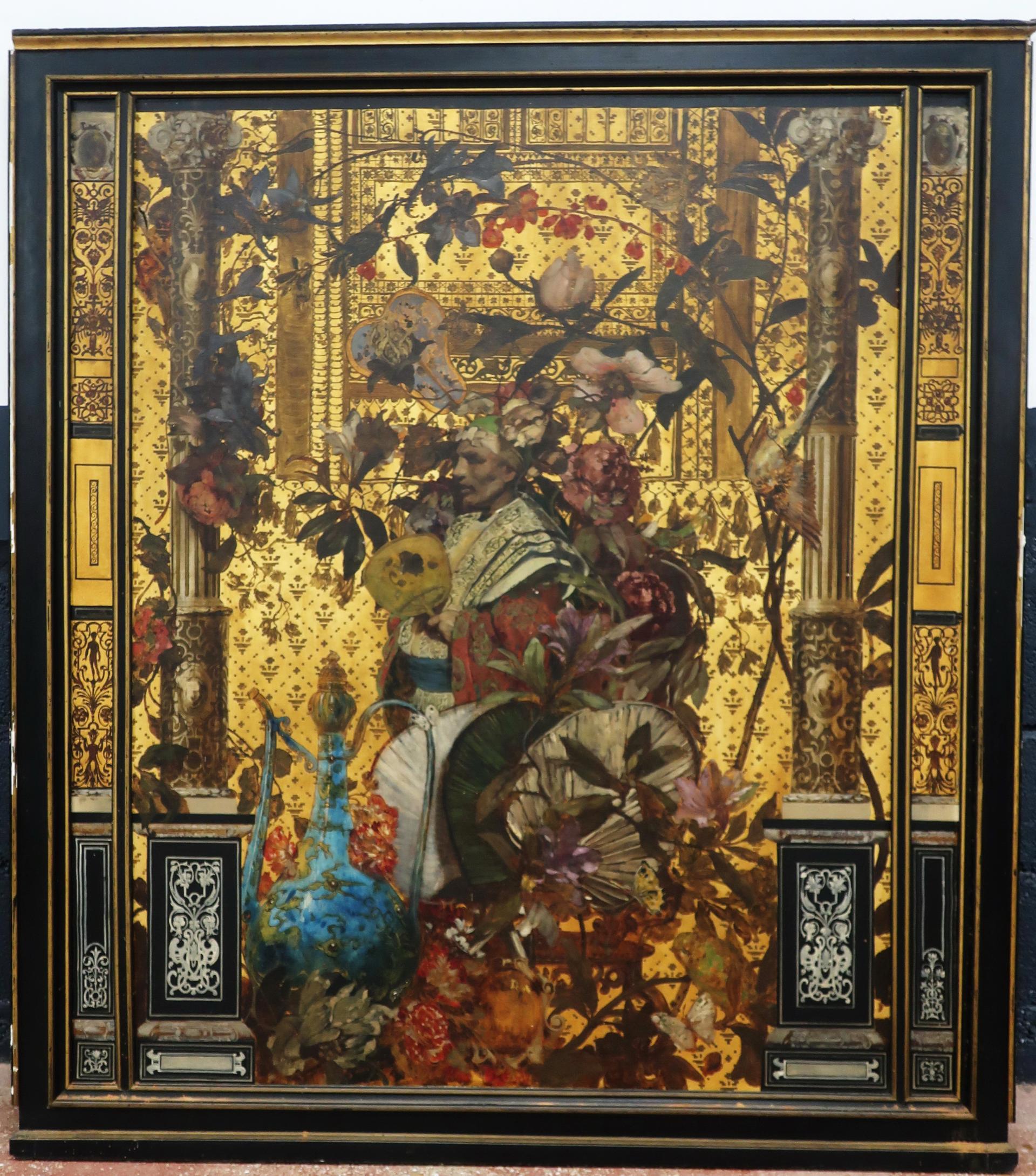 Cave à liqueur d'époque Napoléon III en bois noirci et incrustations de laiton, l'intérieur en cristal de Baccarat à décor gravé d'oiseaux branchés et filets dorés, comprenant quatre carafes (marquées avec la pastille) et quatorze verres à pied (bon état
