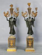 Attribuée à Claude GALLE (1759-1815) : Paire de candélabres en bronze doré et patiné à décor de femmes ailées posant sur des demi-sphères et supportant deux bustes de lions ailés et un vase ovoïde flammé orné d'un caducée et de têtes de faune faisant bras de lumière, socle à décor en bas-relief, époque Empire. Haut : 68 cm