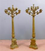 Importante paire de candélabres à bouquet de treize lumières d'époque début XIX's en bronze doré, fut rond fuselé à godrons et acanthes sur base tripode à têtes de lion ailé monopode. Haut : 1,13 m.