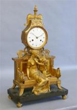 Attribuée à Claude GALLE (1759-1815) : Pendule d'époque Empire en bronze doré à décor d'une jeune femme et l'Amour assis dans une banquette à cols de cygne, surmontée d'un cadran émaillé et sommée d'une torche flammée ailée, socle en bronze patiné. Haut 54 cm (Ref. : voir modèle proche signé du bronzier GALLE et reproduit dans P. Kjellberg : Encyclopédie de la Pendule Française. Edition de l'Amateur, p. 393)