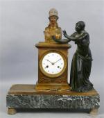106 - Pendule d'époque Empire en bronze doré et patiné sur socle en marbre vert de mer à décor d'une vestale, la borne surmontée d'un buste de Minerve, pieds en carquois de flèche. Haut. : 49 cm (manques notamment un sujet, une frise au socle, le balancier, etc..., état grenier).