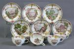 MEISSEN : Six tasses et sous-tasses en porcelaine à décor polychrome de paysages animés en réserve dans des encadrements dorés, époque XVIII's. (une tasse cassée et recollée, petites sautes au décor peint d'une sous-tasse, une tasse avec marque différente)