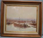 Léon ZEYTLINE (1885-1962) Les péniches Huile sur panneau signé en bas à droite, 129 x 58 cm