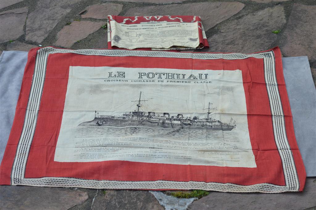 « Le Pothuau Croiseur cuirassé de première classe » Mouchoir imprimé par Renault à Rouen. ABE 67 x 77 cm (réparations) On joint un mouchoir d'instruction du revolver 1873 en reproduction.