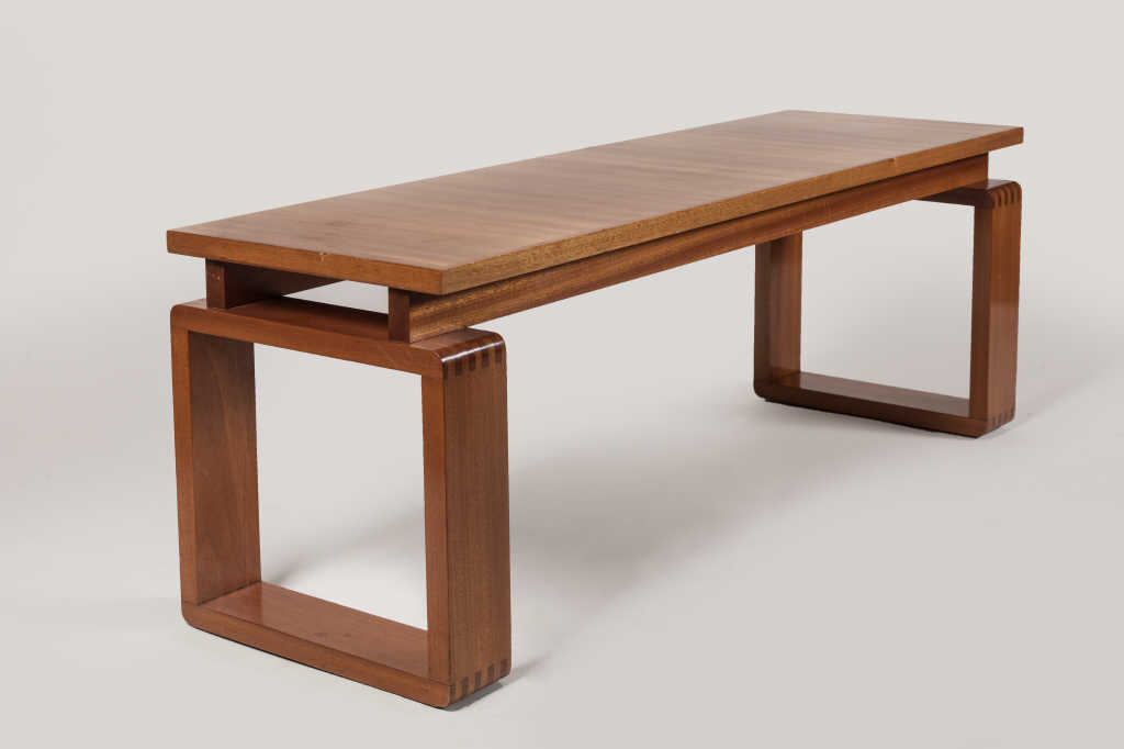 André SORNAY (1902-2000), Longue table basse de forme rectangulaire en acajou à double piétement en carré ajouré. H. 50 cm L. 130 cm P. 40 cm.