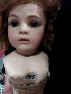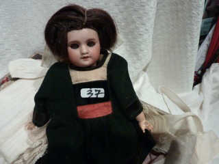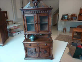 Buffet-vaisselier Henri II en bois 53x 27,5 cm, 2 portes ouvrantes en bas (manque 1 bout du relief rosace sur 1 porte), surmontées d'1 tiroir, et 2 portes vitrées en haut + corniche, joint soupière étain diam 5 cm (couverte à 2 anses).