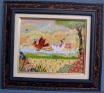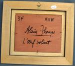 Alain THOMAS (né en 1942) L'oeuf volant Acrylique sur panneau signée en bas à droite, titrée et contresignée au dos 22 x 27 cm