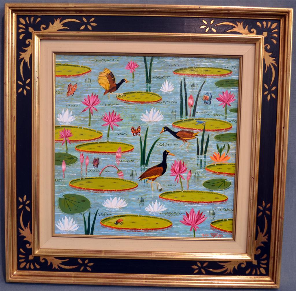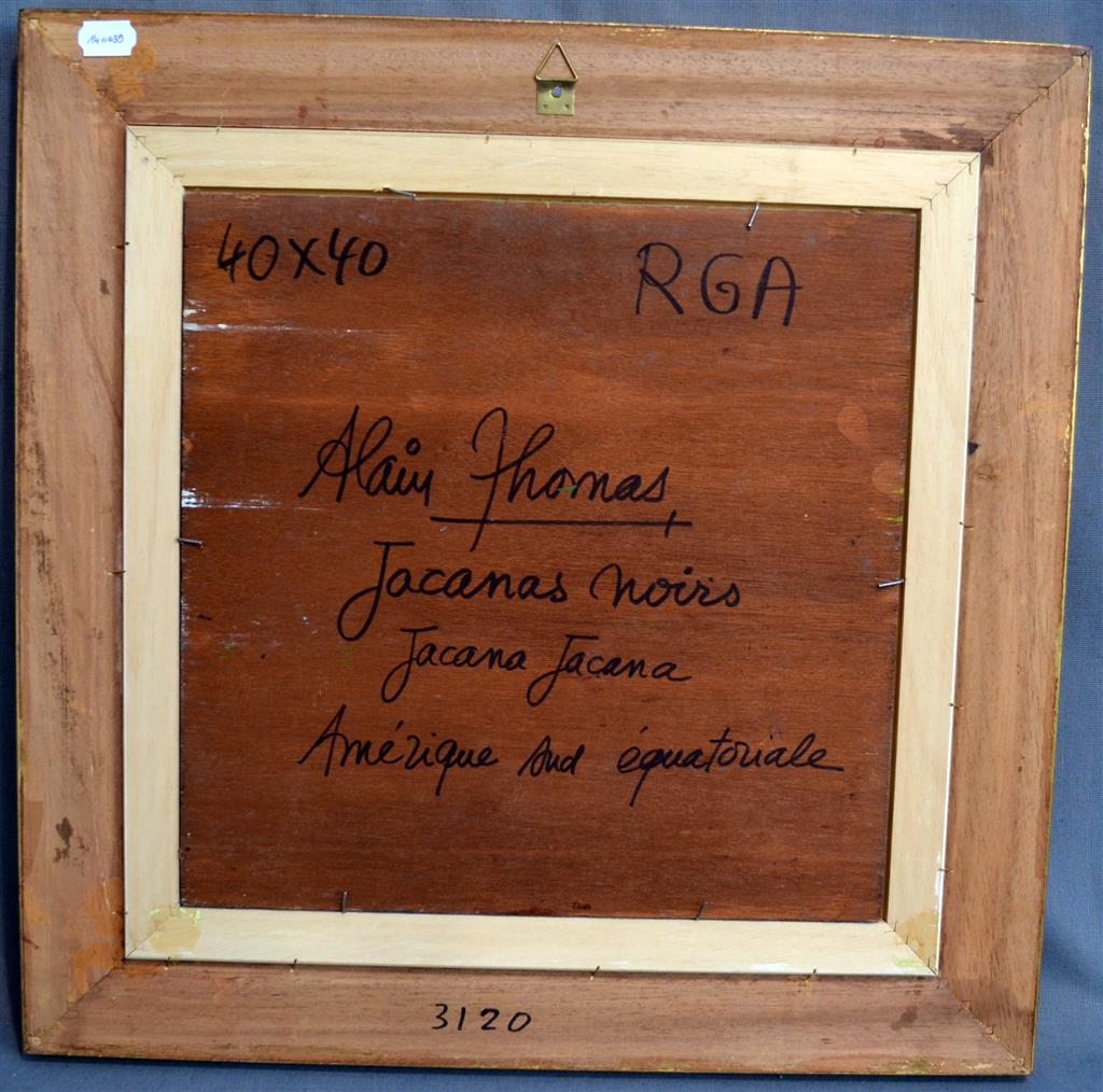 Alain THOMAS (né en 1942) Jacanas noirs, Amérique Sud Equatoriale Acrylique sur panneau signée en bas à droite, titrée, située et contresignée au dos 40 x 40 cm
