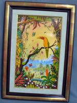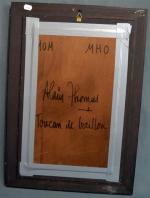 Alain THOMAS (né en 1942) Toucan de baillon Acrylique sur panneau signée en haut à droite, titrée et contresignée au dos 54 x 32 cm