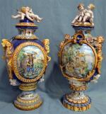 Deux VASES couverts formant fontaines en faïence dans le goût italien à décor polychrome de scènes, chérubins et grotesques H. : 75 cm (accidents, manques)