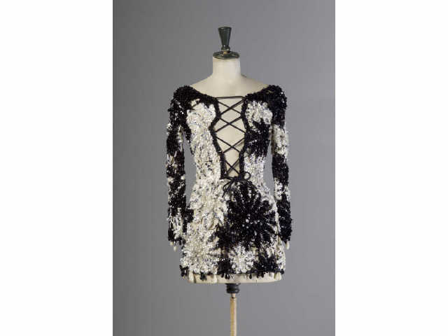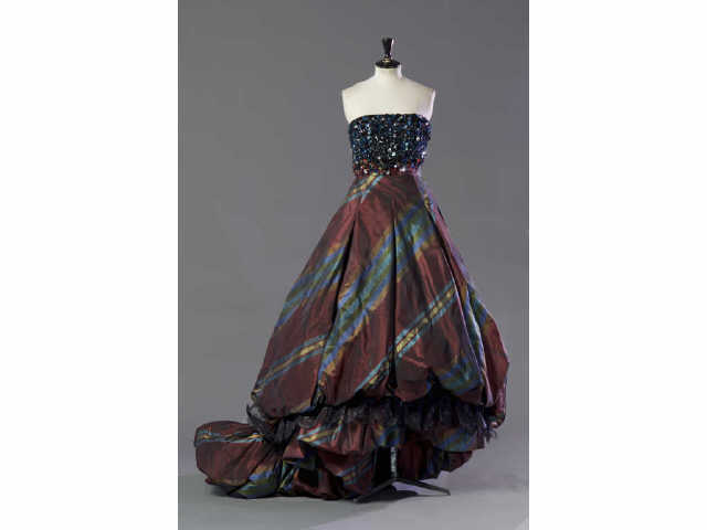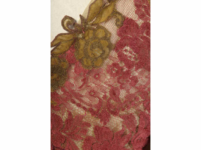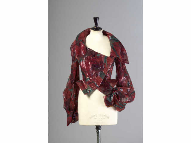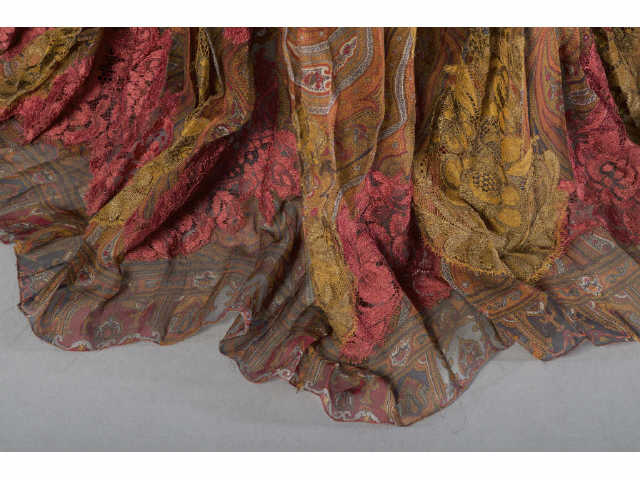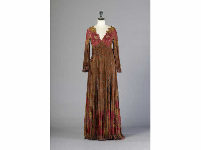 Christian DIOR Haute Couture par Gianfranco Ferré, collection "Les Incroyables et les Merveilleuses", Printemps/Eté 1994. Robe longue en mousseline de soie plissée soleil imprimée cachemire à dominante rouge, orange, beige, décolleté devant et dos en pointe et épaules des manches longues en dentelle à motif floral framboise, beige, rappel dans le bas de la robe. Modèle porté par Estelle Lefebure.