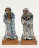 Deux personnages en grès émaillé et terre cuite, socle bois. Haut : 24 cm (petit manque à l'orteil)