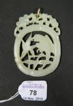 Pendentif en néphrite blanche à décor ajouré d'un oiseau et fleur. . H. 5,2 cm et Long. 6,5 cm.