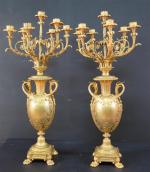 Paire de grands candélabres ovoîdes de style Louis XVI à sept bras de lumières en bronze doré, les anses formées de larges feuilles d'acanthe à enroulement, reposant sur un socle à quatre pieds griffes. Epoque fin XIX's. Haut : 106 cm