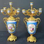 Dans le goût de SEVRES : Paire de candélabres à sept lumières de style Louis XVI, en porcelaine bleu turquoise à décor de deux médaillons ovales ornés de scènes galantes et de bouquets de fleurs, réhauts de dorure, la monture en bronze doré à décor de couronnes de lauriers, les bobèches en porcelaine. Epoque Napoléon III. Haut : 63 cm (petits accidents)